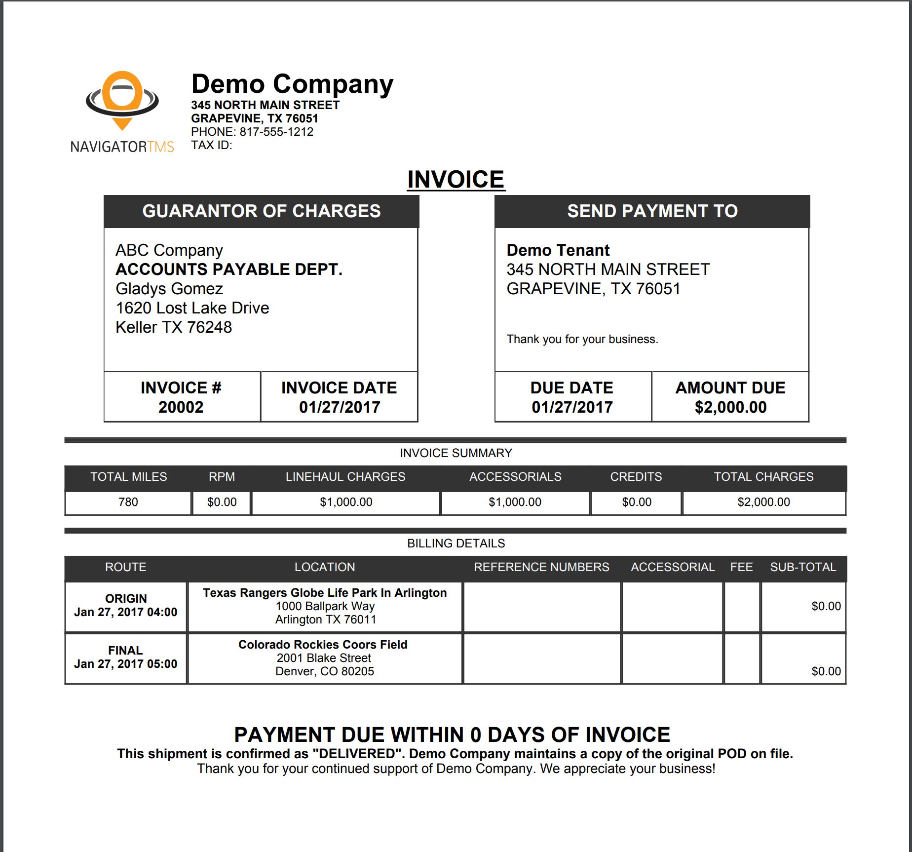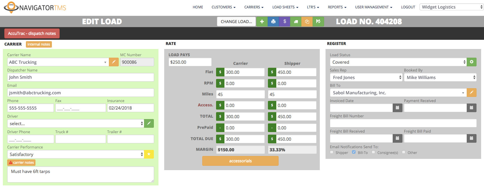 The load sheet is the engine of NavigatorTMS. Loads can be built in a matter of seconds, and then allow all kinds of data to be stored and viewed relative to each individual load. These screens provide an enormous amount of relative shipment and financial data in an instant. Storage capabilities are built into these screens to allow for POD upload and storage, or storage of any other document related to an individual load. Invoicing is easily conducted through these screens. Vast amounts of data on carriers, shippers, consignees, and billing locations are visible and stored on this screen which gives the user any piece of information they need to properly monitor any individual shipment.