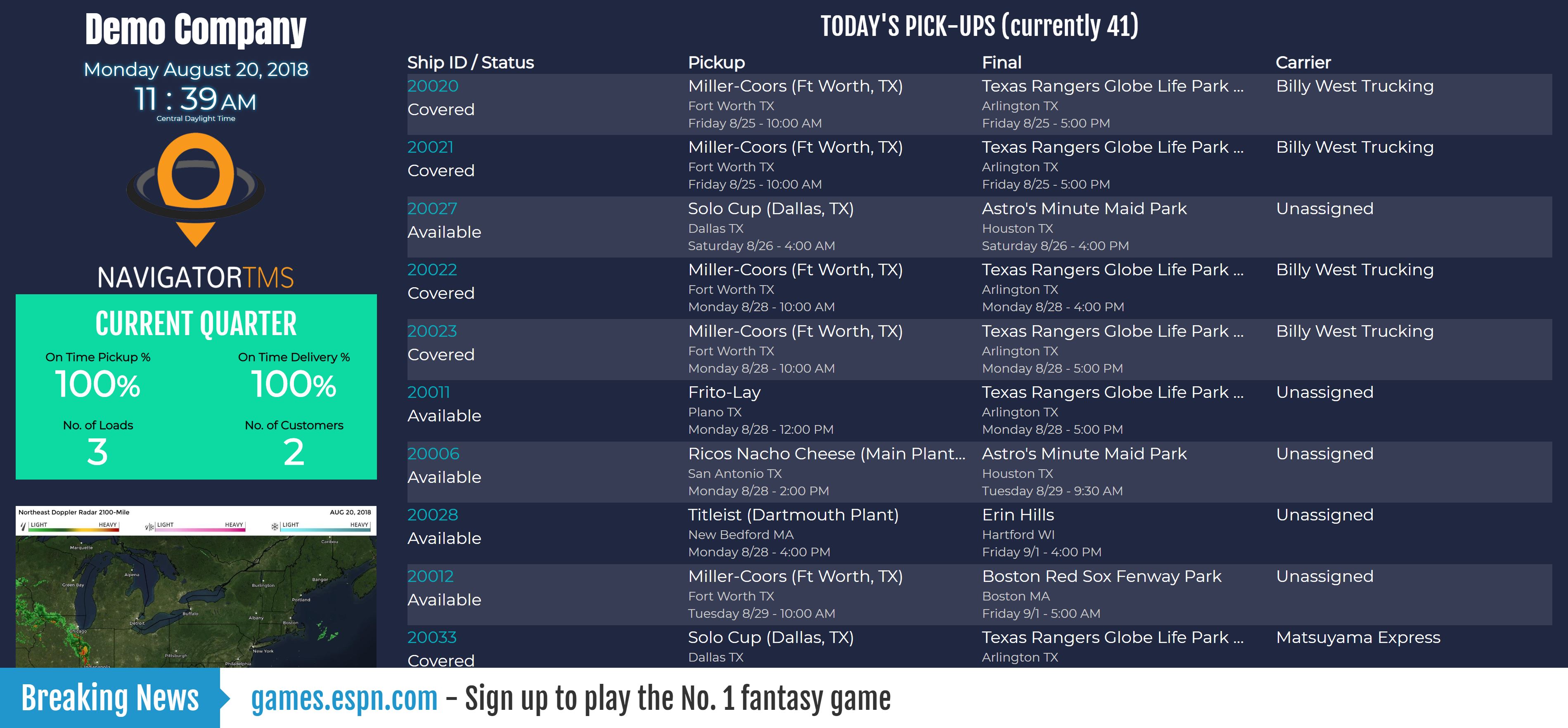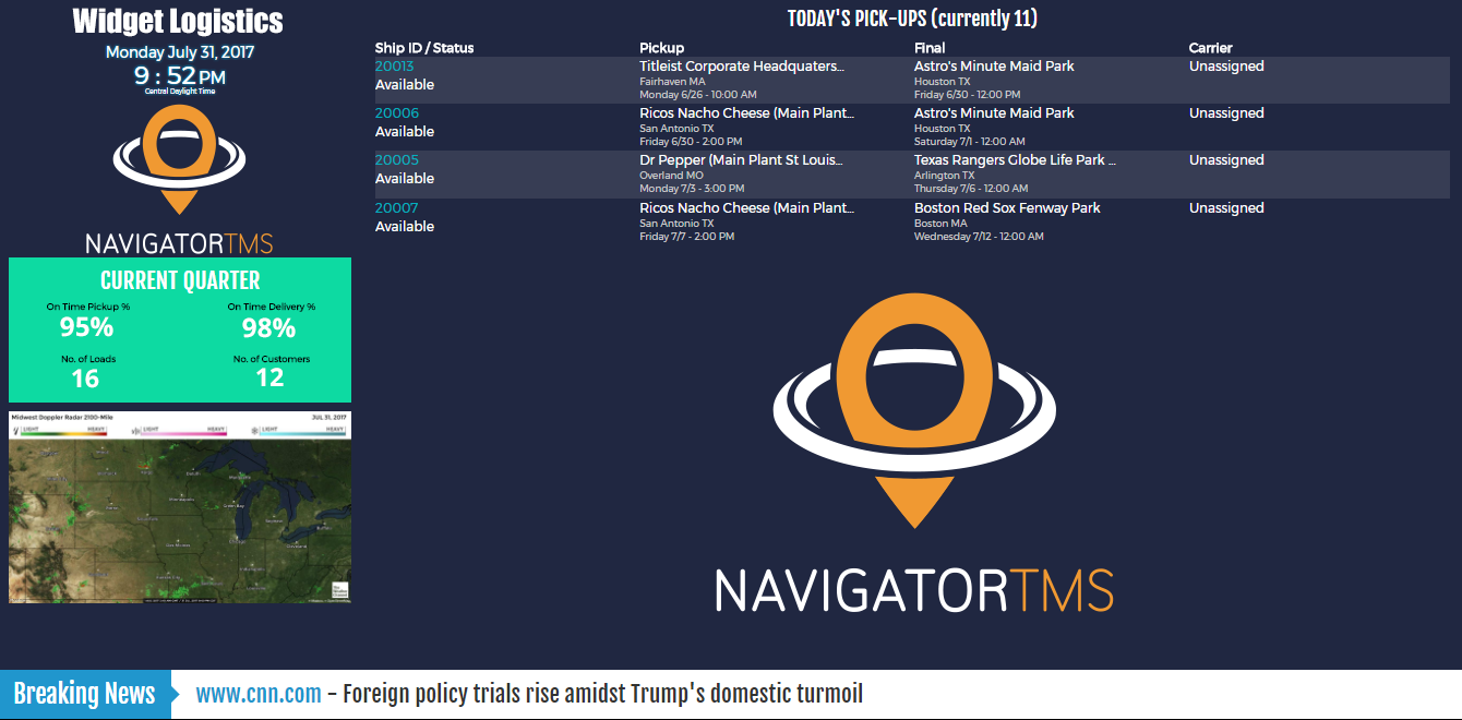 Display your active loads, service levels, current weather maps, and a national traffic map on big screens or monitors in and around your office.